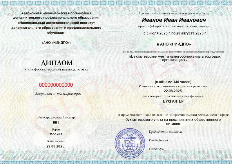 - Диплом с присвоением квалификации бухгалтера-калькулятора по программе дополнительного профессионального образования «Бухгалтерский учет и калькуляция на предприятиях общественного питания»