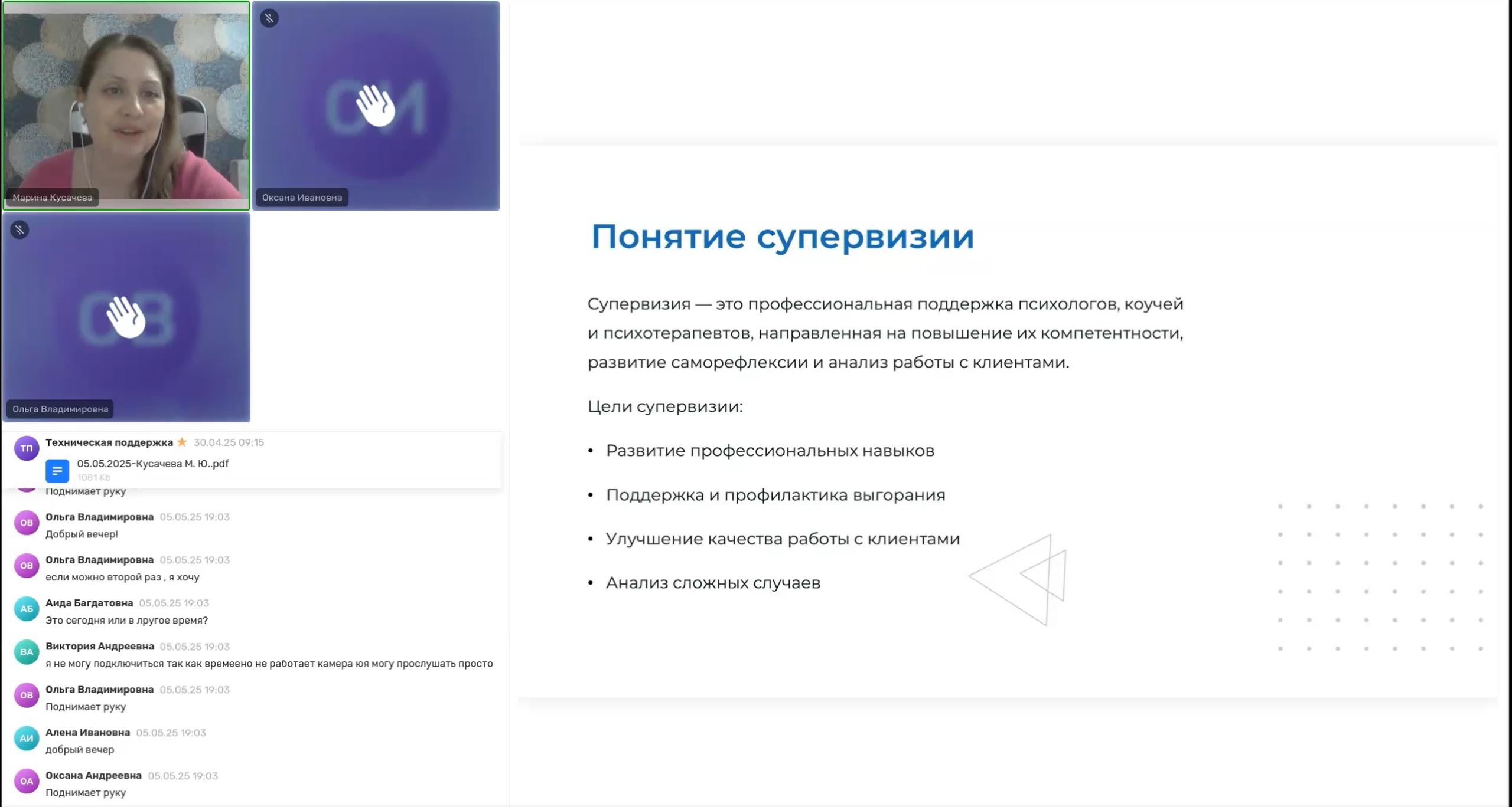 Каждый месяц проходят групповые супервизии для психологов и логопедов — участвуйте в них, чтобы получить помощь практикующего эксперта, задать вопросы и понять, как работать с клиентами.