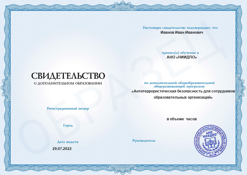 АНО «НИИДПО» – автономная некоммерческая организация, которая обладает теми же полномочиями, что государственные образовательные учреждения. Департамент образования города Москвы выдал АНО «НИИДПО» лицензию на осуществление образовательной деятельности. Проверить наличие разрешительной документации можно на сайте Рособрнадзора в разделе «Сводный реестр лицензий». Для этого достаточно ввести ИНН 7724318601.