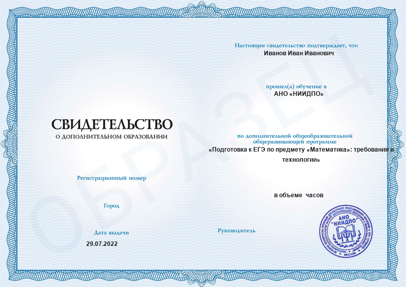 Свидетельство о дополнительном образовании. Вышлем его на вашу электронную почту в течение 14 рабочих дней после окончания обучения.