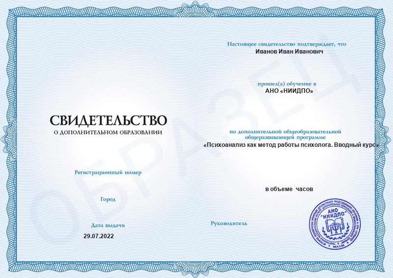Учебный план дополнительной общеобразовательной программы «Психоанализ как метод работы психолога. Вводный курс»