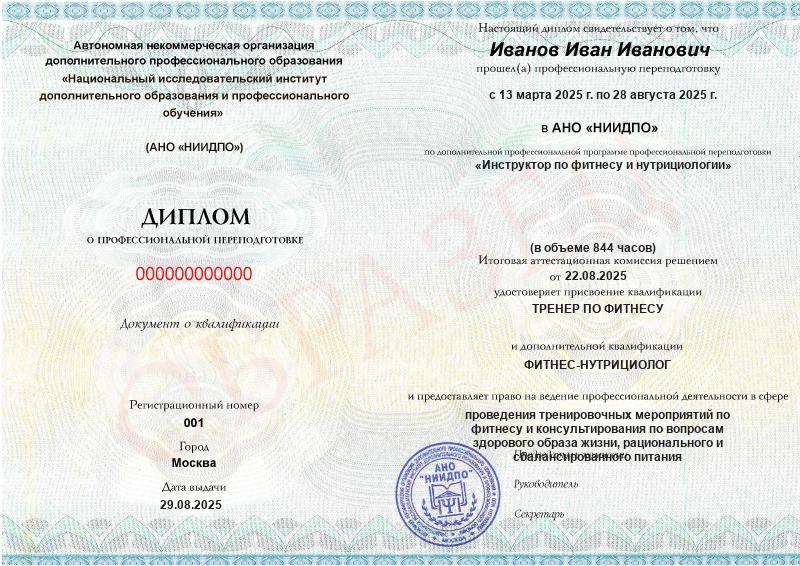 Диплом о профессиональной переподготовке с присвоением квалификаций «Тренер по фитнесу» и «Фитнес-нутрициолог»