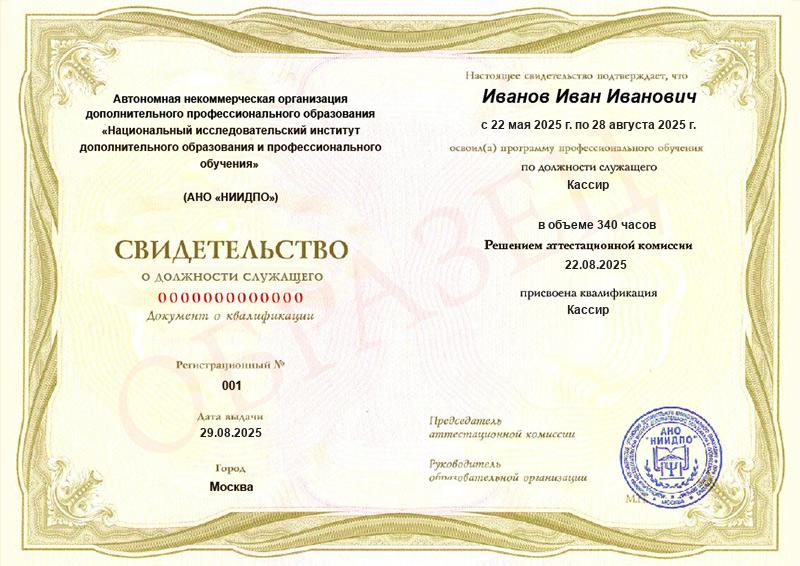 • Документ о квалификации: свидетельство о должности служащего установленного образца