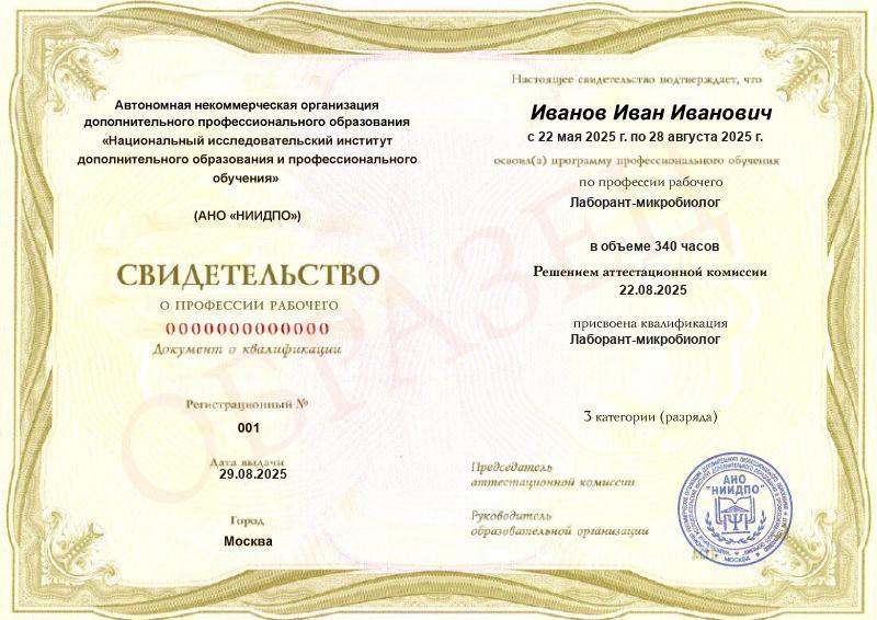 - Свидетельство АНО ДПО «МАСХ» о профессии рабочего с присвоением квалификации «Лаборант-микробиолог» — выдается выпускникам со школьным аттестатом
