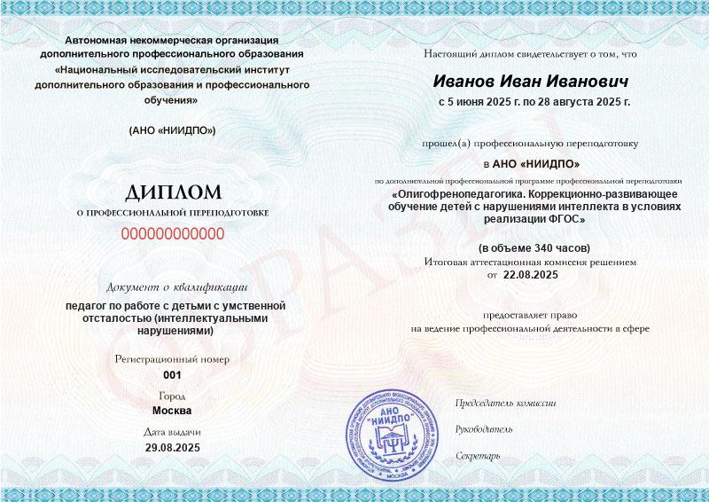 - Квалификация: педагог по работе с детьми с умственной отсталостью (интеллектуальными нарушениями)