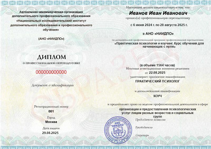 - Диплом о профессиональной переподготовке установленного образца с правом на ведение профессиональной деятельности в сфере психологического консультирования
