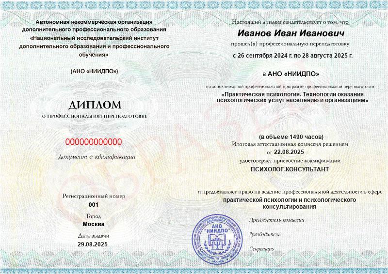 - Квалификация: Психолог-консультант