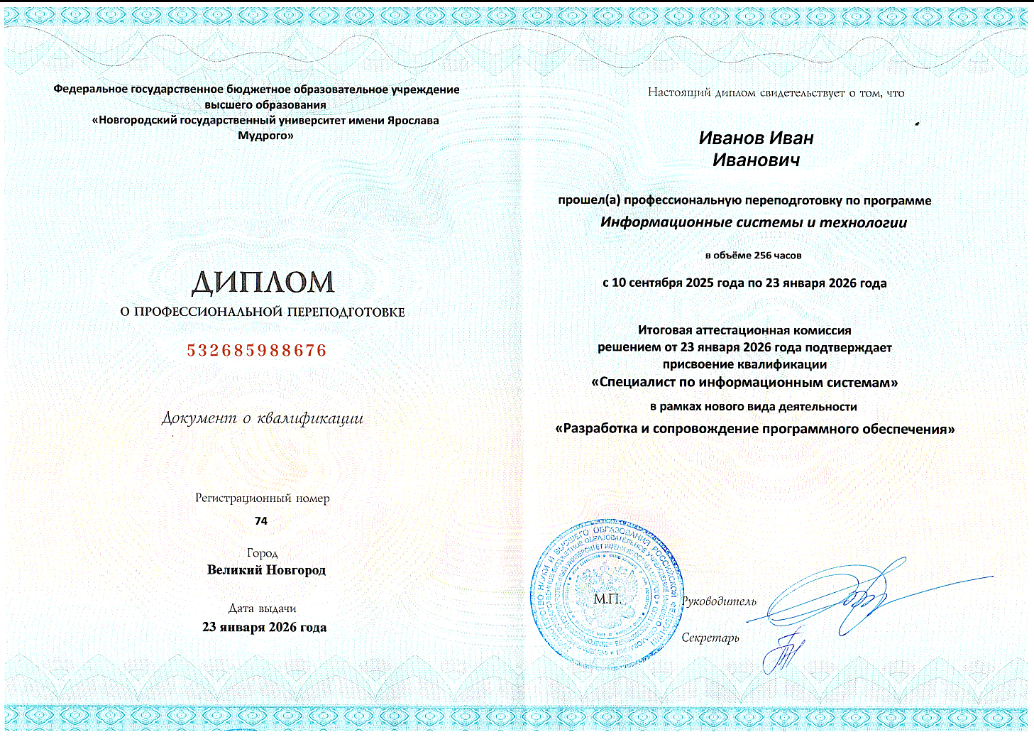- Диплом о профессиональной переподготовке ФГБОУ ВО «НовГУ»