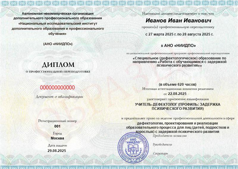 - Квалификация: Учитель-дефектолог (профиль: задержка психического развития)