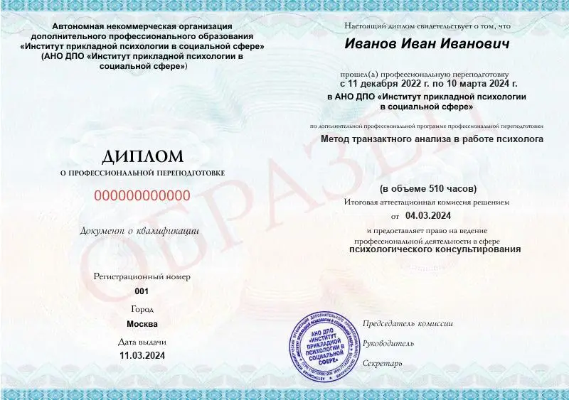 - Диплом о профессиональной переподготовке установленного образца с правом на ведение профессиональной деятельности в сфере психологического консультирования
