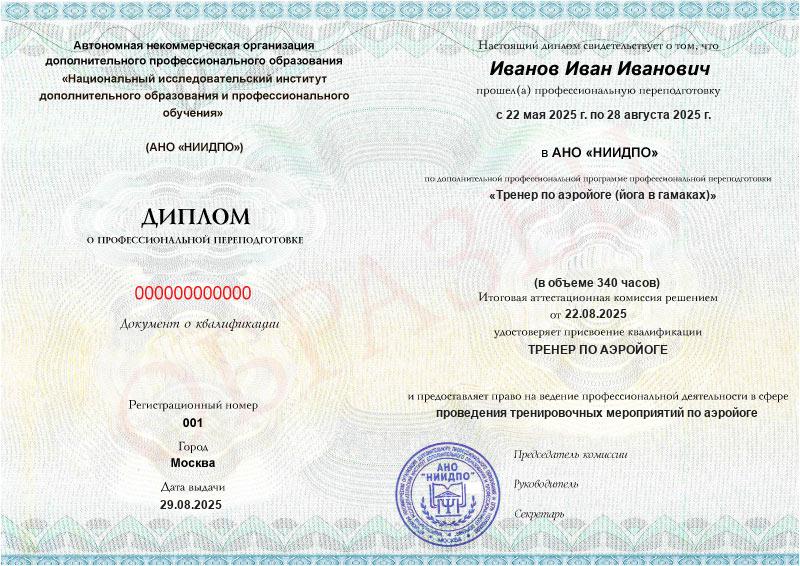 - Квалификация: Тренер по аэройоге