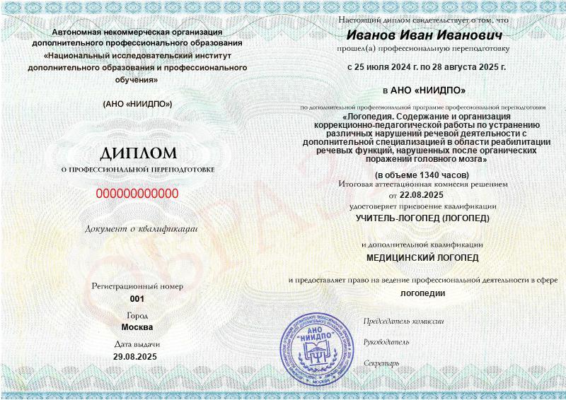 Логопедия. Содержание и организация коррекционно-педагогической работы по устранению различных нарушений речевой деятельности с дополнительной специализацией в области реабилитации речевых функций, нарушенных после органических поражений головного мозга (1340ч)