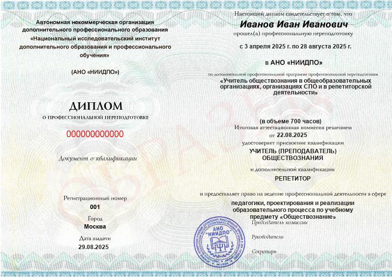 - 2 квалификации: Учитель (преподаватель) обществознания + Репетитор